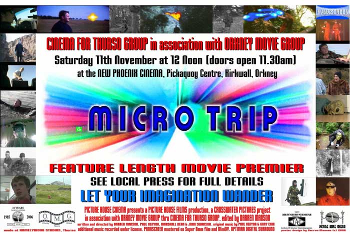 Micro-Trip was a full-length presentation made up of ten short films. The films were, Green & Stone, Communication Breakdown, Picture House Gazetteer, Dummies, Seven Shades, Out of this World, Photograph, American Dog, Trepidation and The Bilbster Adventure. The presentation was created by Darren Manson of 'Cinema for Thurso' with films from Orkney Movie Group, Sypeland Tib and Cinema for Thurso.